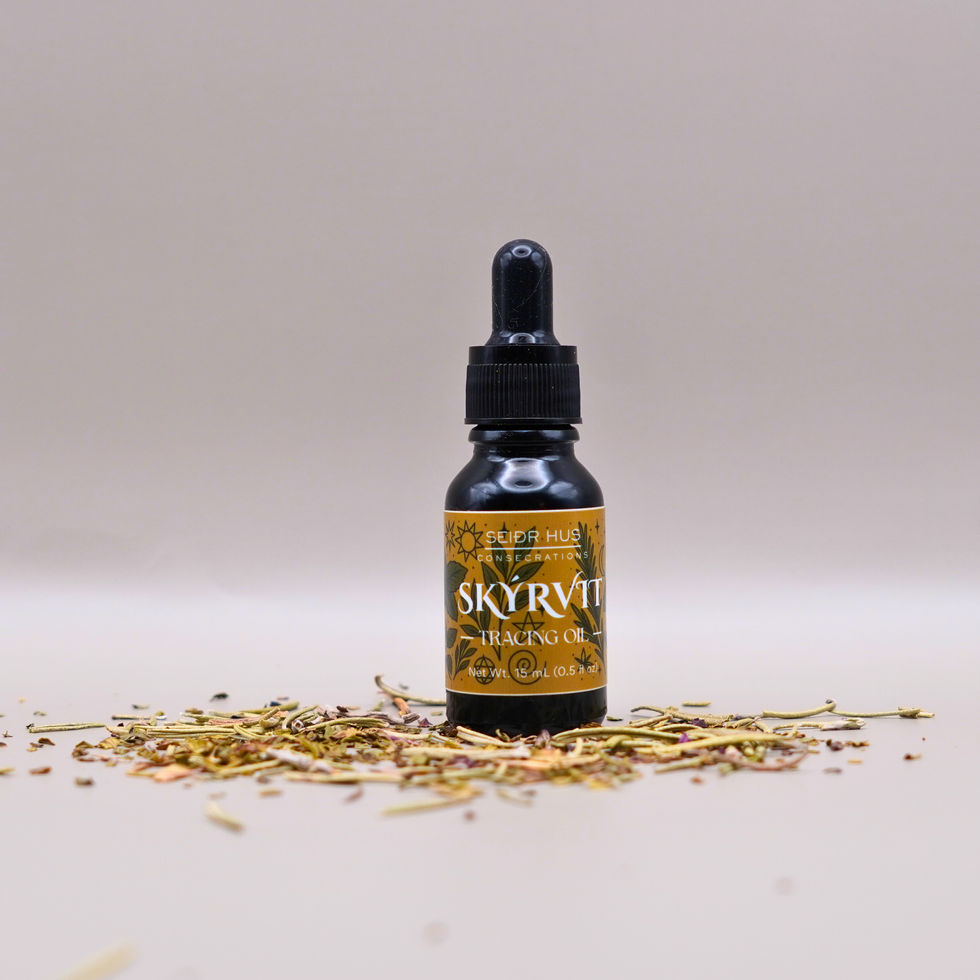 Seiðr Hus Skýrvit Tracing Oil is a sharp, herbal blend of rosemary and peppermint in grapeseed oil, brightened with basil and juniper berry. Lightweight and quick-absorbing, it’s made for tracing sigils, marking pulse points, or carrying clarity into ritual.